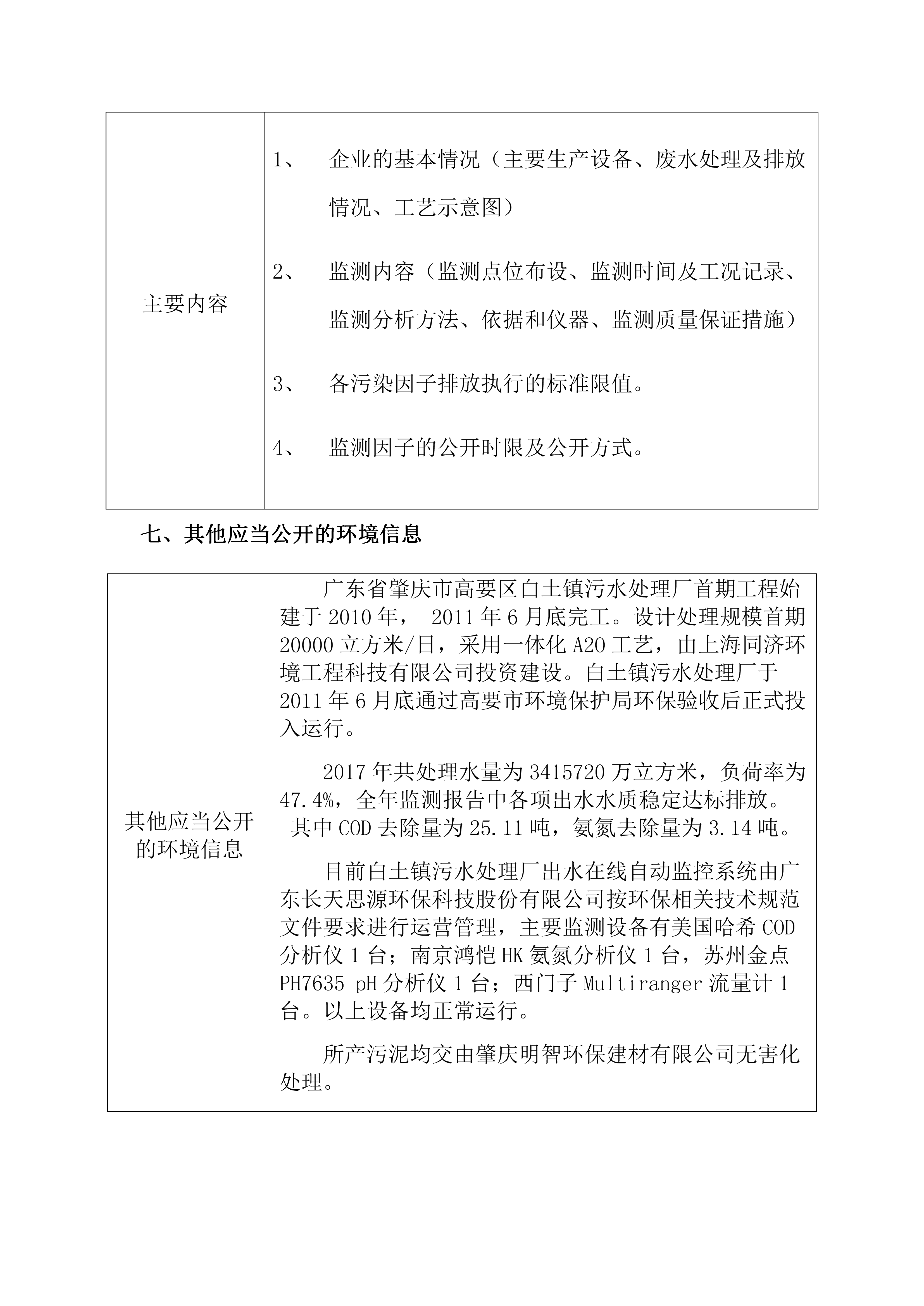 广东省肇庆市同济水务有限公司白土镇污水处理厂 2017年环境信息公开表